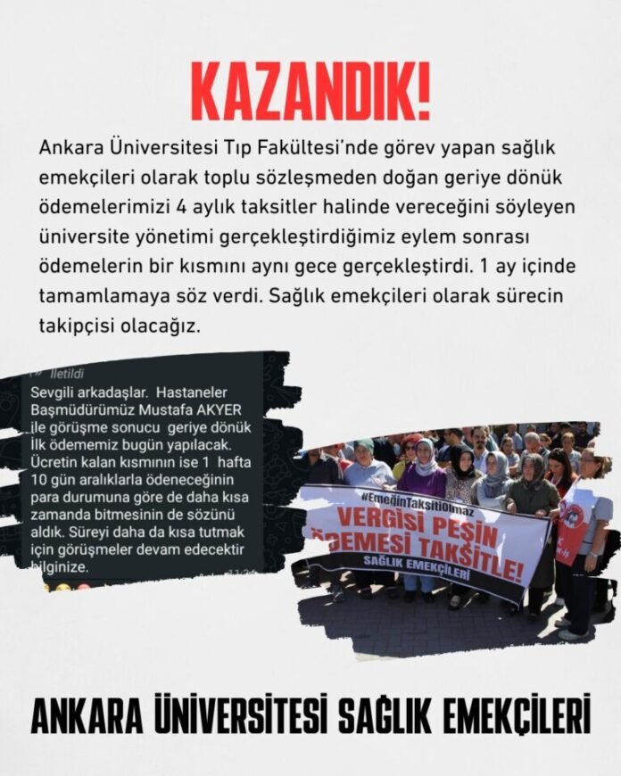 Kararlı mücadeleleri sonuç verdi. Dev Sağlık-İş Ankara’nın duyurusuna göre, eylem sonrasında eksik ödemelerin bir kısmı aynı gün içinde yatırıldı; kalan ödemelerin de önümüzdeki bir ay içinde tamamlanacağı taahhüt edildi.