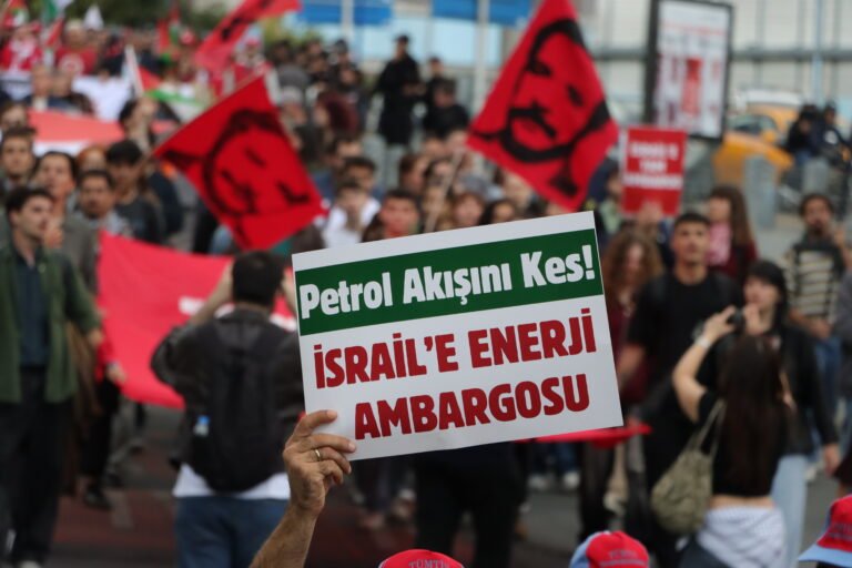 Filistin Eylem Komitesi, soykırımın ikinci yılında İsrail’e tam ambargo talebiyle bugün (5 Ekim) AKM’den Dolmabahçe’ye yürüyüş düzenledi. “Emperyalizm yenilecek, direnen halklar kazanacak” ve “Yaşasın küresel intifada” sloganlarıyla başlayan yürüyüş, Almanya Konsolosluğu önünden devam etti.