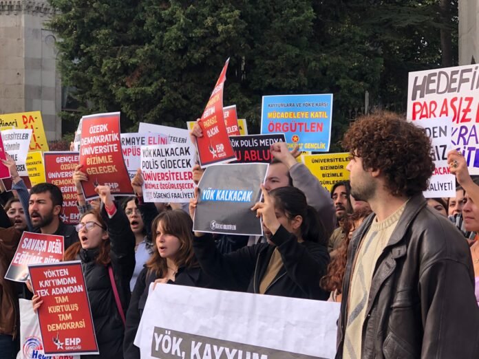 6 Kasım 2025, İzmir – Ege Üniversitesi ve Dokuz Eylül Üniversitesi öğrencileri, Yükseköğretim Kurulu’nun (YÖK) 44. kuruluş yıldönümünde sokaktaydı. Öğrenciler, Alsancak’taki ÖSYM binası önünden Dokuz Eylül Üniversitesi rektörlüğüne yürüyüş düzenledi.