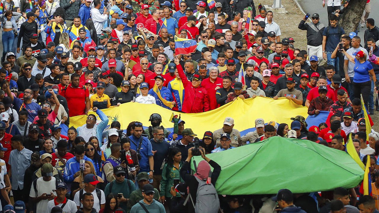 Polis, asker, milis ve sivillerden oluşan geniş katılımcı grubu, olası bir dış müdahale girişimine karşı ulusal birlik mesajı verdi. Maduro’nun fotoğraflarını taşıyan kalabalık, devlet başkanına destek sloganları attı.