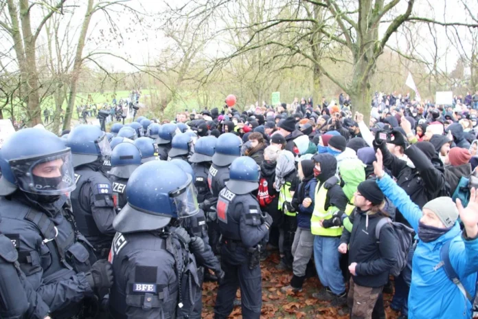 Protestolar sırasında kalabalığın arasına karışarak fotoğraf çektiği belirtilen üç kişinin aşırı sağcı olduğu iddia edildi. Kitle bu kişilere tepki gösterince polis devreye girerek onları koruma altına aldı. Antifaşistler Lahn kıyısında aşırı sağcıları ve polis korumasını abluka altına aldı; ancak yüzlerce polisin sert saldırısıyla çok sayıda kişi yaralandı ve ambulanslarla hastanelere taşındı. Eylemler gün boyunca kentin çeşitli noktalarında devam etti.