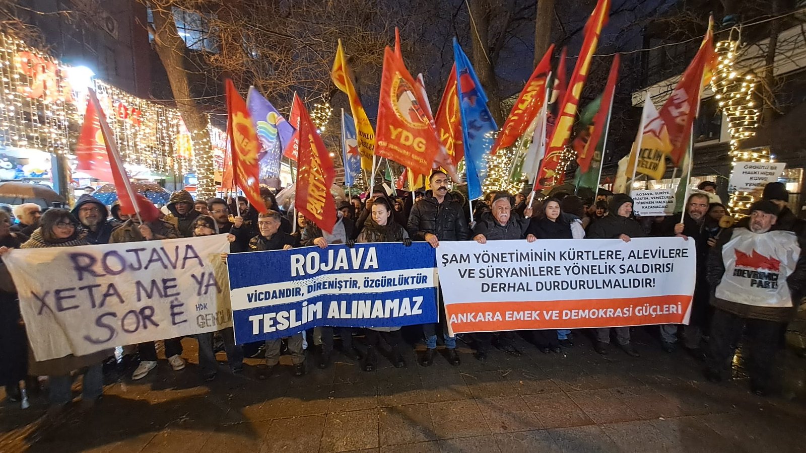 Suriye’nin Halep kentinde, HTŞ yönetimindeki Savunma Bakanlığı’na bağlı güçlerin Kürtlerin yoğun olarak yaşadığı Şeyh Maksud, Eşrefiye ve Beni Zeyd mahallelerini ağır silahlarla hedef alması Ankara’da protesto edildi. Ankara Emek ve Demokrasi Güçleri, saldırılara tepki göstererek iktidara “Bu suçun ortağı olmayın” çağrısında bulundu.
