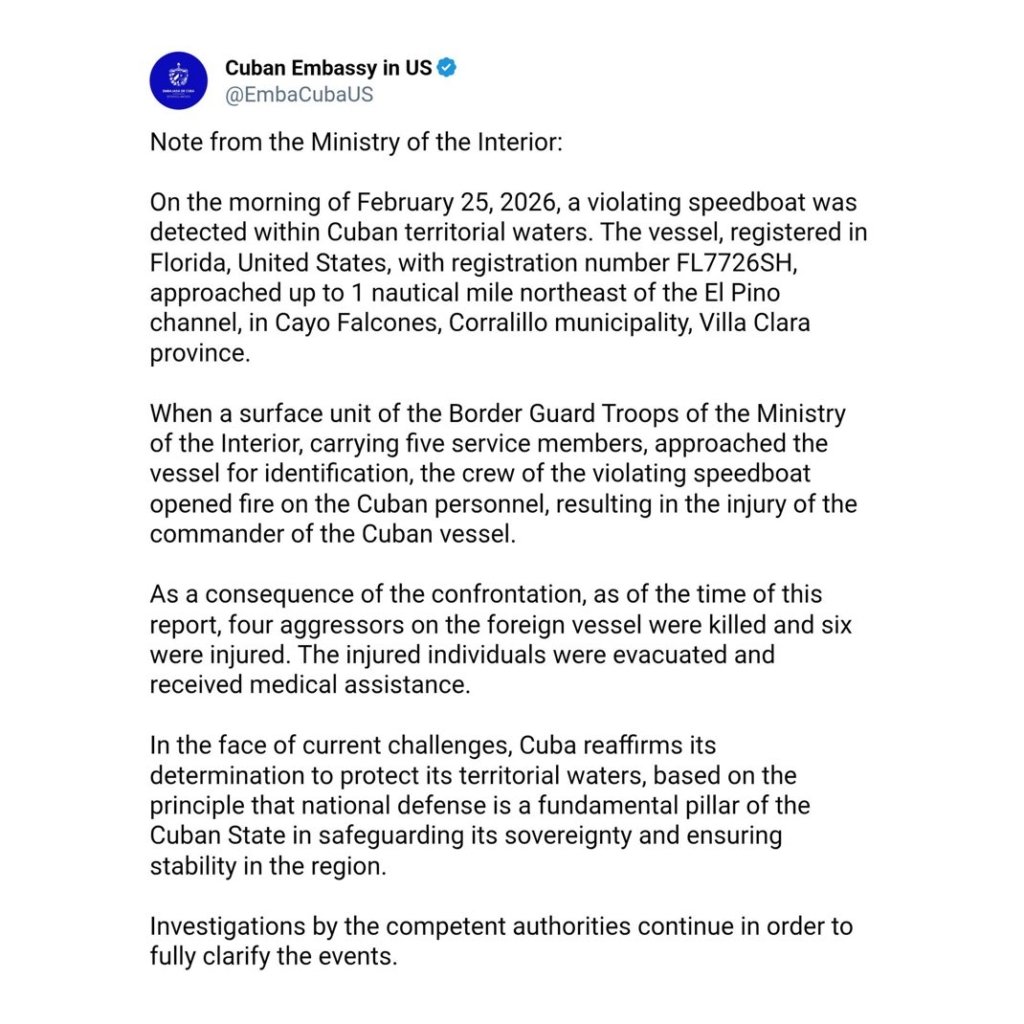 25 Şubat 2026 sabahı, Küba karasularını ihlal eden bir sürat teknesine sınır muhafızları tarafından müdahale edildi. Müdahale esnasında sürat teknesinden açılan ateşe karşılık verilmesiyle 4 kişi öldürüldü. ve altı kişi yaralı olarak ele geçirildi.